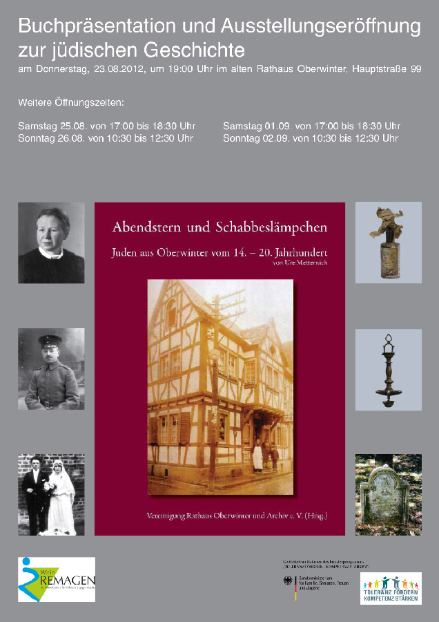 In der Ausstellung von Ute Metternich über die jüdische Bevölkerung in einem kleinen Ort am Mittelrhein werden diese und andere Fragen beantwortet, wird ihre Lebenssituation vom 14. bis zum 20. Jahrhundert in einen geschichtlichen Zusammenhang gestellt, werden Erzählungen der älteren Generation ebenso berücksichtigt wie die Auswertung historischer Quellen und Fotos.
