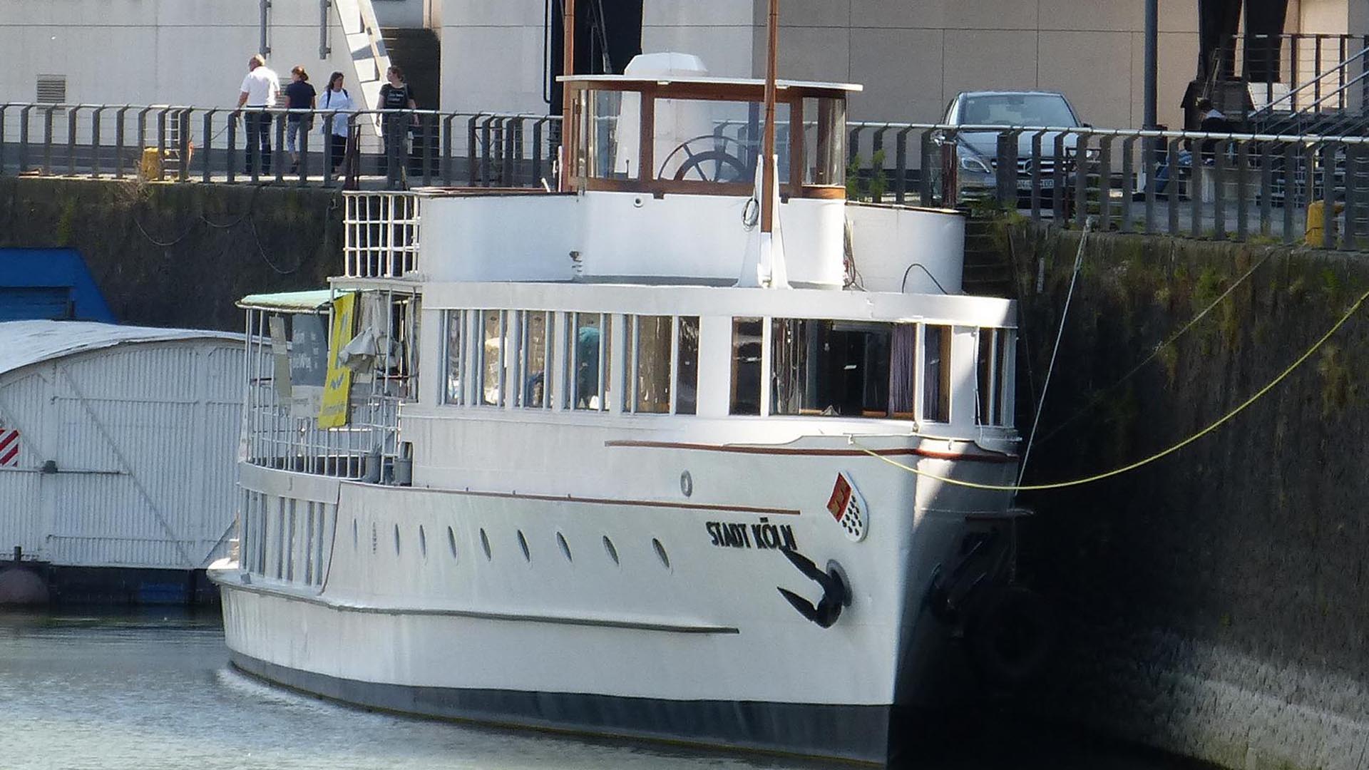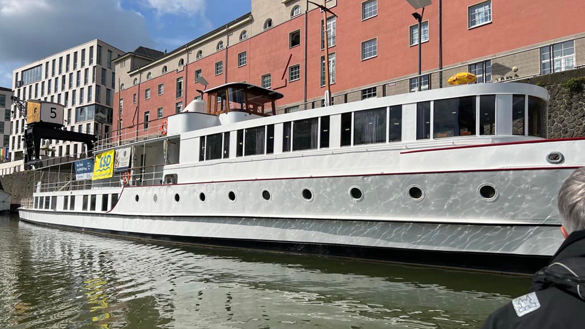 Im Hafen angekommen gab er zunächst einen kurzen Überblick über die wechselvolle Geschichte des 1938 gebauten Schiffes. Die Wirren des Krieges überstand es unter einem Tarnnetz im Hafen von St. Goar und wurde erst 1952 wieder an die Stadt Köln zurück gegeben. Von da an diente es als Repräsentationsschiff für höchste Gäste und Staatsbesuche in Köln, darunter Queen Elisabeth II, Charles de Gaulles und John F. Kennedy.