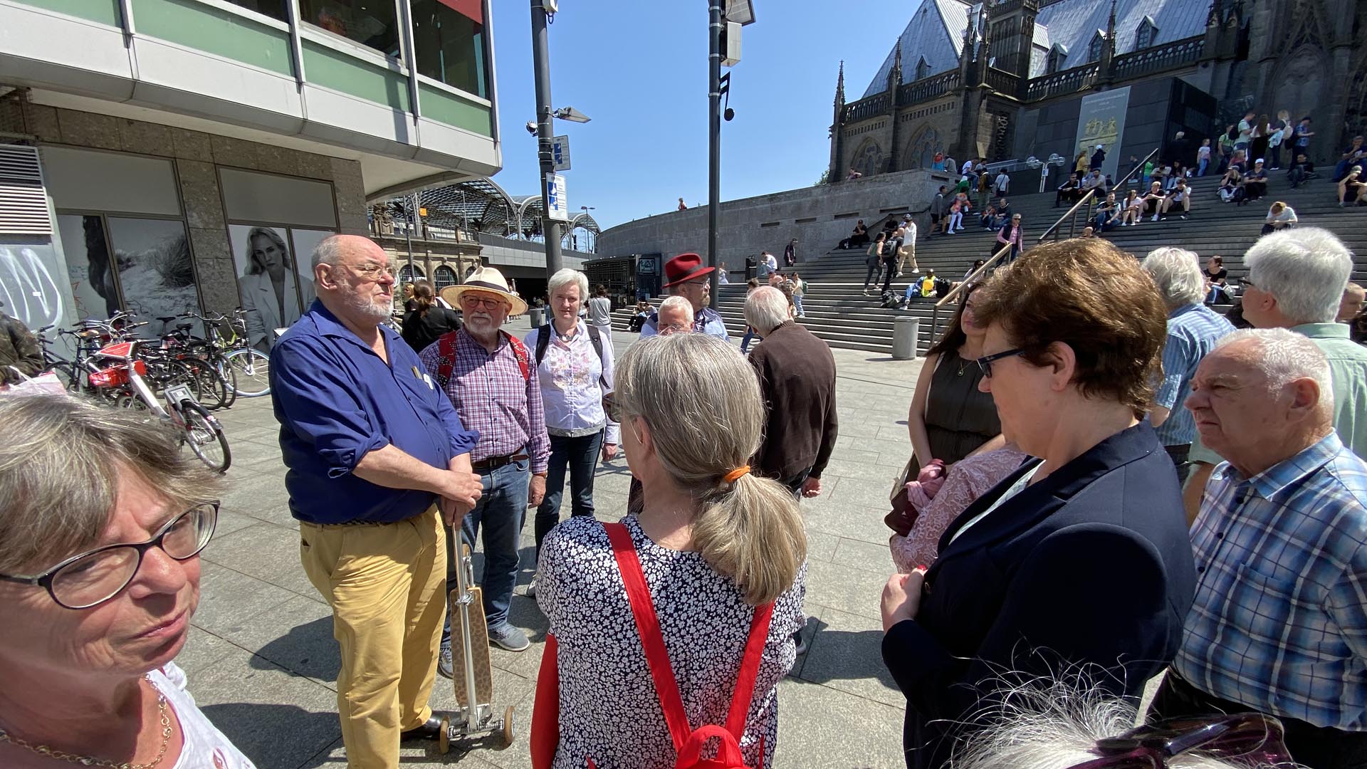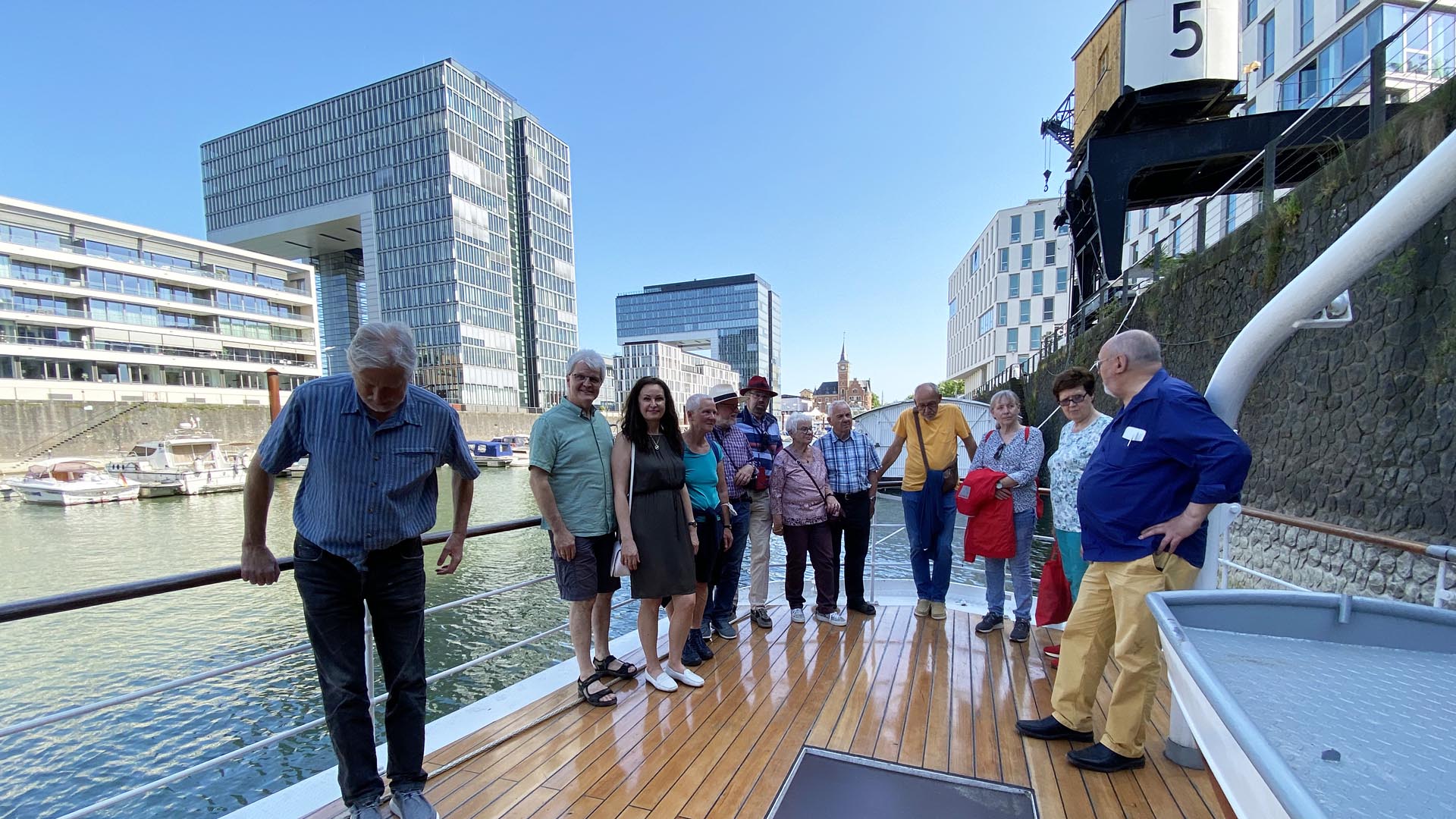 Am Hauptbahnhof wurden sie aufs herzlichste von Udo Giesen, dem Vorsitzenden des Vereins der Freunde und Förderer des historischen Ratsschiffs MS Stadt Köln begrüßt. Auf dem Weg zum Rheinauhafen nutzte er die Gelegenheit noch einige der reichlich vorhandenen Krätzchen zu Örtlichkeiten entlang des Weges zum Besten zu geben.